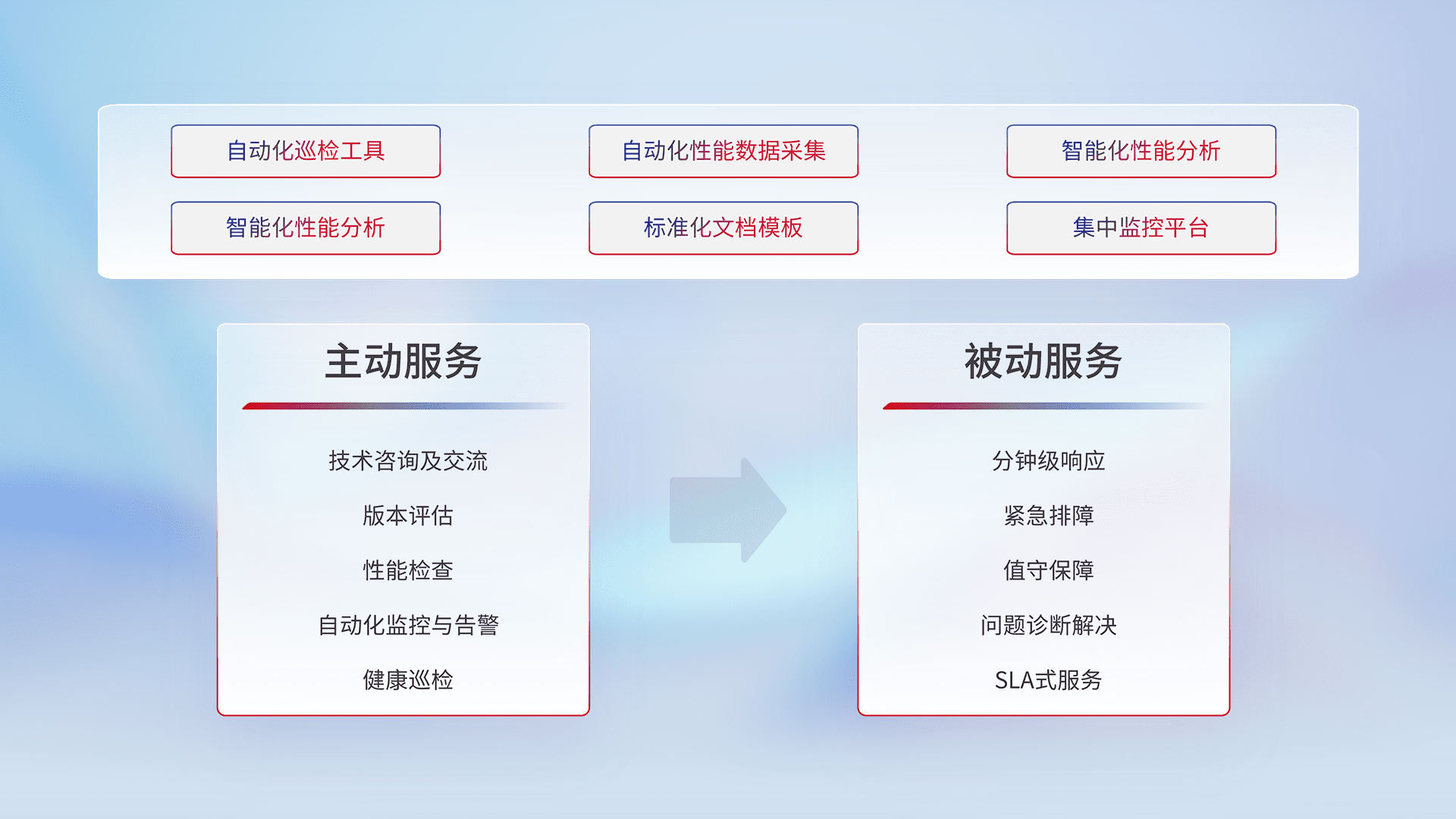 智能化工具和标准化文档,,保障服务质量,,提供主动服务(包含技术咨询、、、版本评估、、性能检查、、自动化监控与告警、、、健康巡检)和被动服务包含(分钟级响应、、紧急排障、、值守保障、、问题诊断解决、、SLA服务)。。